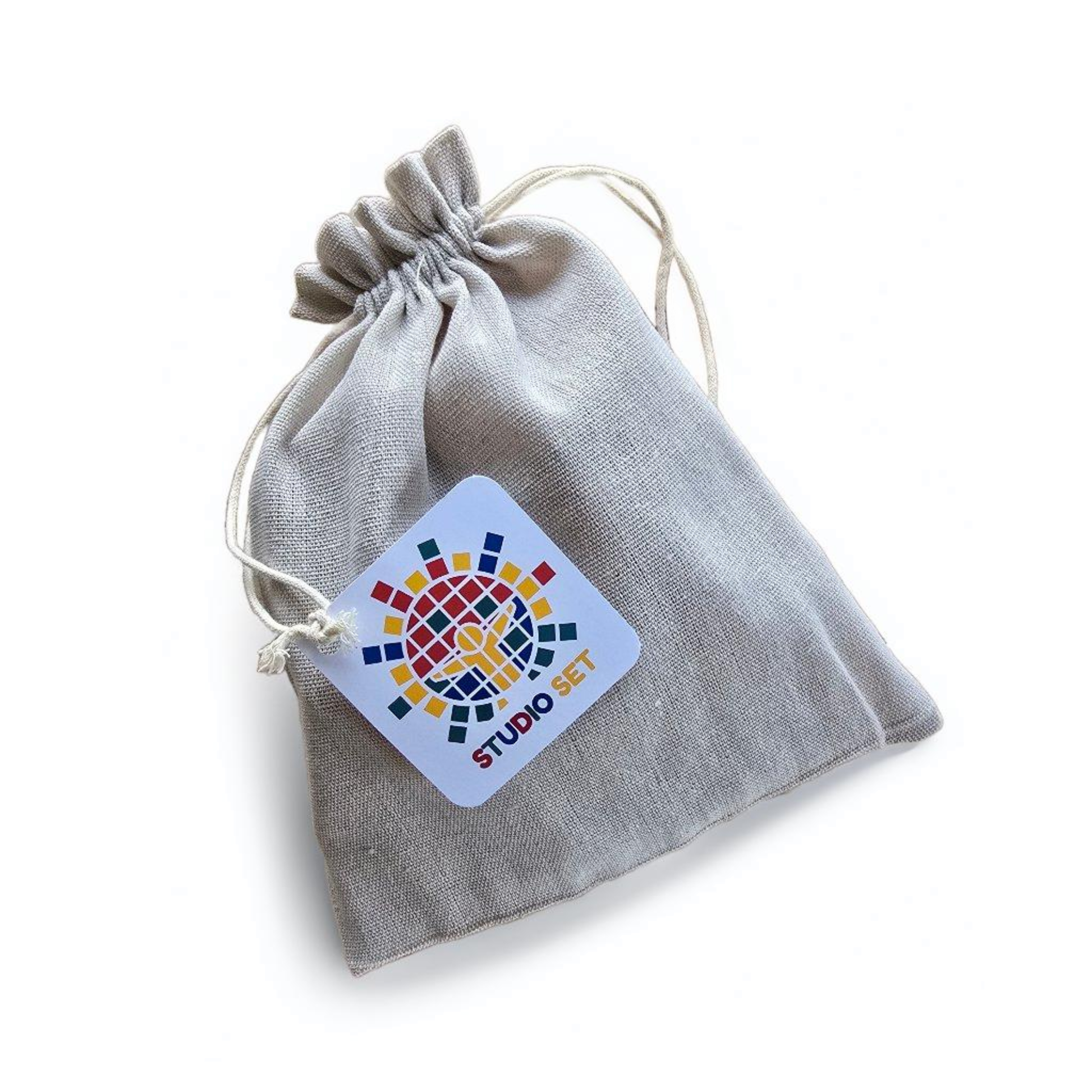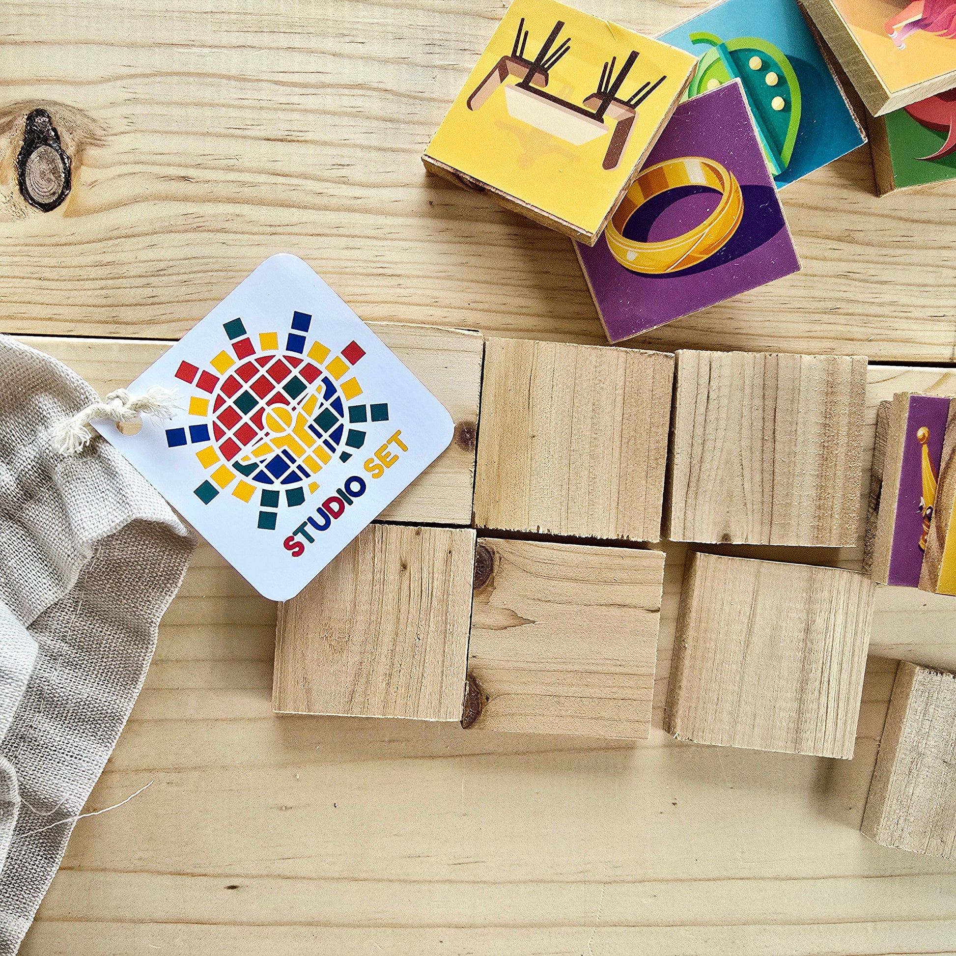 A Studio Set comes with one full set of 20 laminated wooden picture tiles stored in a smaller bag with 16 custom tile covers and a wooden tray.